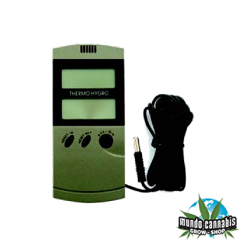 Medición desde -30 a +70 ∫C, registra temperaturas máximas y mínimas, registra humedad relativa desde 25 % a 98 %, sonda de 3 metros de longitud para situar en la zona de cultivo. Funciona con pilas de 1,5 voltios.