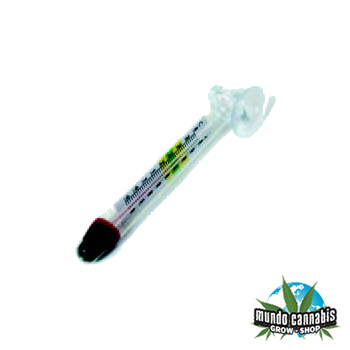 Termómetro de mercurio que incorpora una ventosa para sujetarlo a la pared del depósito de alimentación.